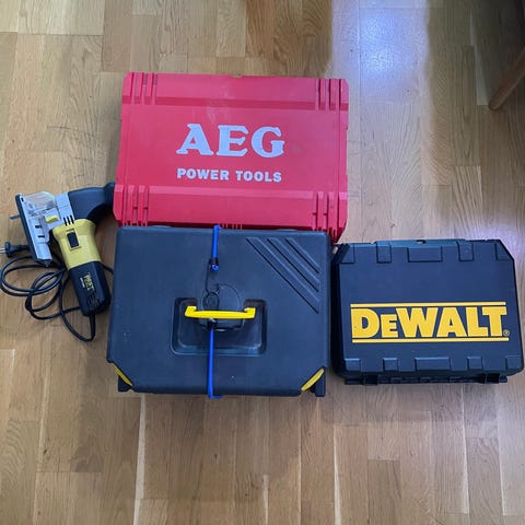 Set med olika handverktyg inklusive skruvmejslar, skiftnycklar, fil, bågfil, Dewalt borrmaskin, rörtång och en verktygsväska. Verktygen är av olika storlekar och typer, lämpliga för allmänna reparations- och underhållsarbeten.