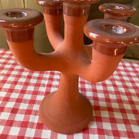 Retro ljusstake i rött trä med handmålad dekor. Ljusstaken har en rund bas med blommönster och en pelarformad hållare för ljus. Är ni mycket fint skick, kan finnas mindre märken men knappt något som syns. Höjd 15 cm, diameter fot 9 cm, diameter för ljuset 2 cm.