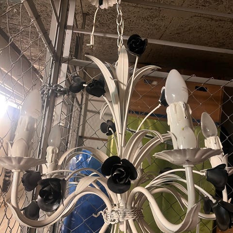 Tack lampa i vit metall. Lampan har flera ljuskällor och en dekorativ design med böjda metallarmar. Passar för installation i tak och ger belysning i olika rum , 5. Lampor E14 glöd lampa med följer , finns i Västerås .