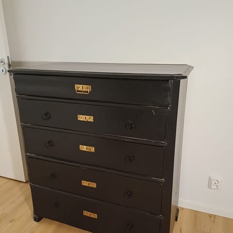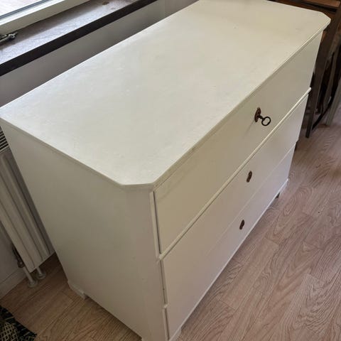 Liten byrå med tre lådor. Hörnornament i mörkare trä. Mässingshandtag med utsirad dekor. De två översta lådorna är i mycket gott skick, den nedersta lådan behöver ses över. Byrån kan hämtas i Täby,