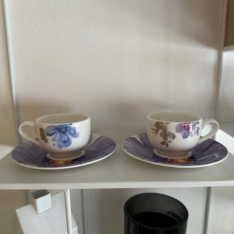 Fem koppar och sex fat från Villeroy & Boch, i toppskick. Tillverkade i Luxemburg, troligen på 70-talet. Kopparna är 60 mm höga och har diametern 57 mm. Faten har diametern 122 mm.