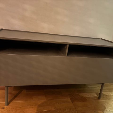 Coolt förvaringsskåp med flera hyllor och metallhandtag. Skåpet är avsett för förvaring och organisering av olika föremål. Mediamöbel Malibu köpt på Mio möbler för ett antal år sedan.