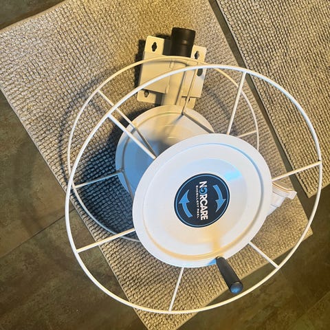 Canvac Cleanvac centraldammsugare med tillhörande slang och rör. En fast installerad dammsugare avsedd för effektiv rengöring i hem eller mindre lokaler.