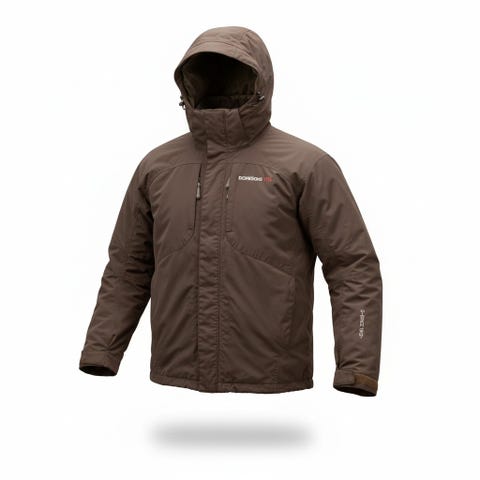 Didriksons jacka i en mörk blå färg med flera fickor framtill och en huva. Jackan har dragkedja och knappar fram.