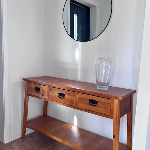 Stilren och gedigen hallmöbel med äkta mörk marmorskiva, tre lådor och praktisk hylla undertill. Perfekt som avlastningsbord i hall, vardagsrum eller sovrum.
