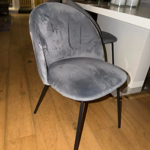 Mörkt grå sammet med ben i mässing. Tyget är tåligt och går att torka av.