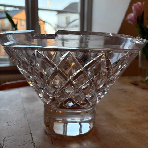 Sökord: kristallskål, glasskål, gul skål, art deco, vintage glas, retro skål, fasetterad glasskål, oktagonal skål, walther glas, cloud glass, 1930-tal stil, inredning, dekoration, samlarskål, serveringsskål, julklapp.