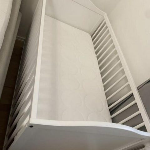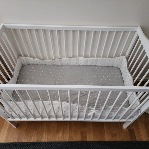 Vårt barnbarn växte upp snabbt. Han hann inte sova i spjälsängen vi köpte åt honom mer än ett par gånger. Spjälsängen är nästan ny. Den passar för en bebis upp till ungefär ett år.