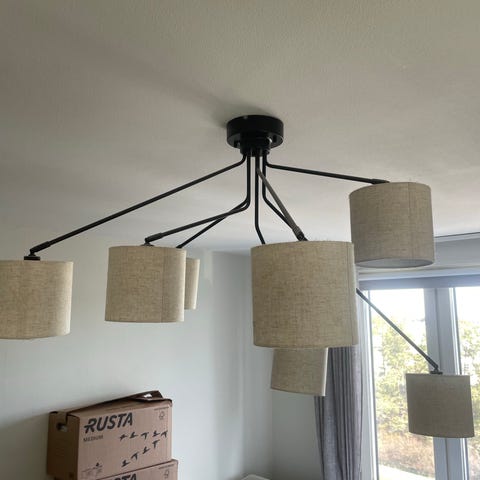 Säljer våran superfina taklampa med fyra hängande lampor pga flytt,. Lamporna är mörkgrå (som på bild 1. & 2. )Sparsamt använt & är i mycket bra skick.