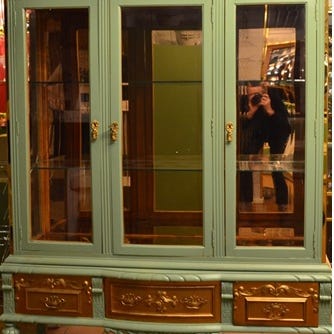 Elliptical pair-doors in ash and stainless steel with integrated bubble design components in clear acrylic glass. This cabinet has been carefully used in an overnight apartment.
