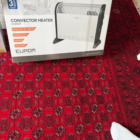 Elektrisk värmeelement i vitt utförande med termostat och två strömbrytare. Utrustad med bärhandtag och ventilationsgaller för effektiv värmefördelning. Passar för uppvärmning av mindre till medelstora rum.