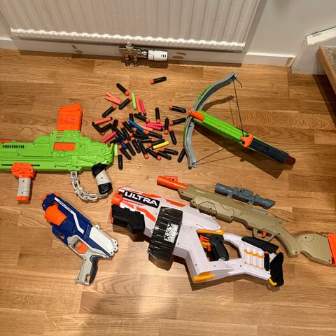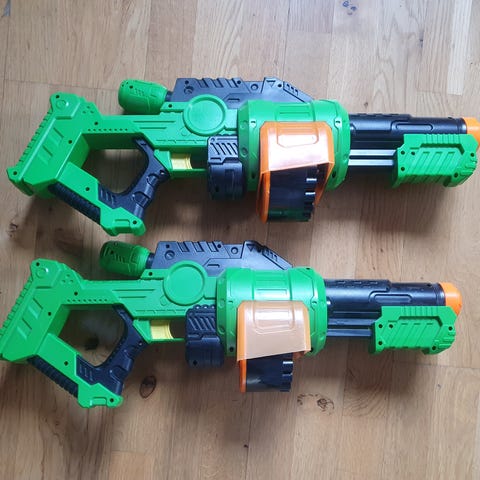 Nerf gevär i olika modeller och utformningar. Det är för det mesta i bra skick något gevär har lite halvdan kraft men alla ser fina ut. Finns en mängd tillhörande skott som följer med. Om ni har några frågor så är det bara att höra av sig.