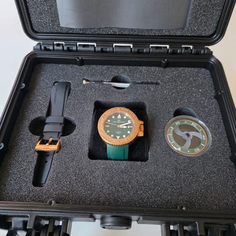 Klockan är utförd i stål och levereras med läderband. Alla delar är helt original. Den är köpt direkt av Sjöö Sandström och levereras komplett med originalbox, certifikat, kvitto och övriga tillbehör. Inköpt 2016.