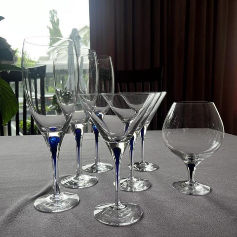 12 nya oanvända Orrefors Intermezzo blå droppe martiniglas i kartong. 3000 kr. Pris kan diskuteras vid snabb och smidig affär.