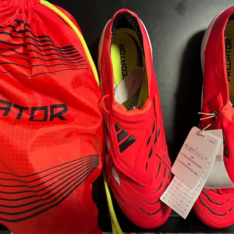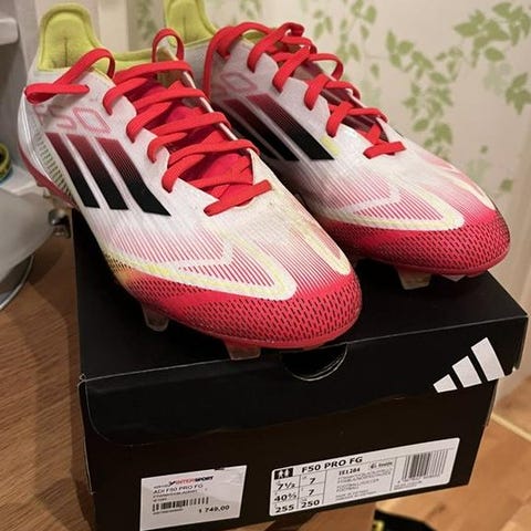 New Balance Furon V8 fotbollsskor i vit och guld färg. Skorna har en lätt design med snörning och är anpassade för fotbollsspel. Modellen har en yttersula med dobbar för bra grepp på gräsunderlag.