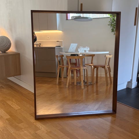 spegel med träram i naturligt träutförande. Spegeln har en rektangulär form och är utrustad med upphängningsanordning på baksidan för väggmontering. Ramen är tillverkad av trä och spegelglaset har vissa användningsspår.