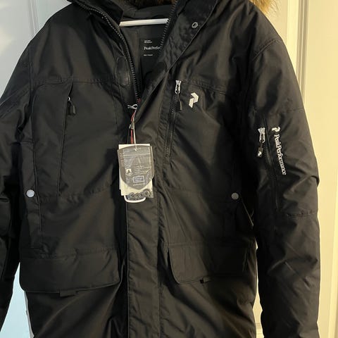Peak Performance säger allt. Ytter tyget är av polyamid, foder/linning är av osså polyamid, fyllning är av 80% gåsdun o 20% gåsfjäder. En jacka du aldrig lär frysa i, Värdefull jacka för extrema väder konditioner. Mer info i en av bilderna. Har en annan Peak Performance jag använder under vintertid. Denna jackan har använts ett par gånger under åren. Ser ny ut o fräsch. Rekommenderar ändå att den tvättas (har legat på vinden) OBS!!! Tvättas separat i 30 grader utan sköljmedel. Minst 5 tennisbollar ska in med jackan i torktumlaren i låg värme.