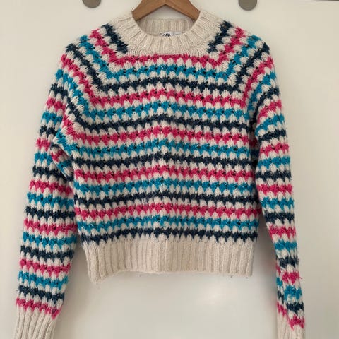 Tröjan har en kabelstickad design fram och är långärmad.