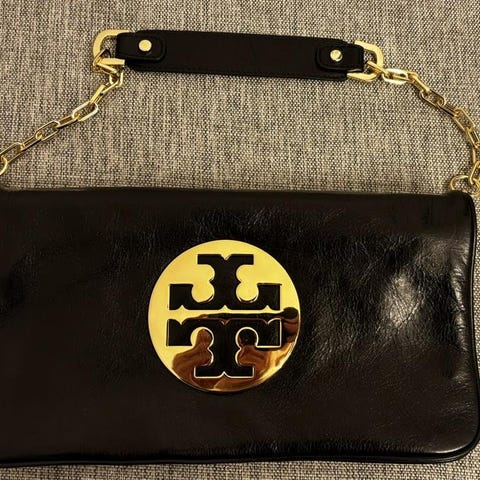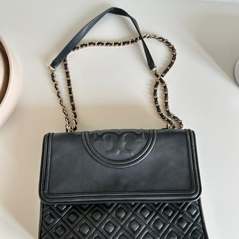 Tory Burch plastic bag for women in red. The bag has a square shape with gold-colored details and a chain as a shoulder strap. It is made of plastic material and has an embossed Tory Burch logo on the front.