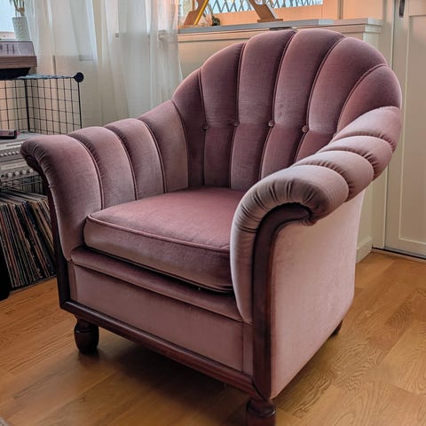 Gungstolen "Bohem", formgiven av Lena Larsson för Nesto Möbelfabrik (Nässjö Stolfabrik) på 1960-talet. Är en lätt möblerad och skön gungstol. Jag har två stycken som blir ett fint par.