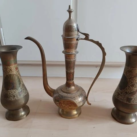 1 Mässingskanna ca 38 cm höjd + 3 muggar ca 8 cm.