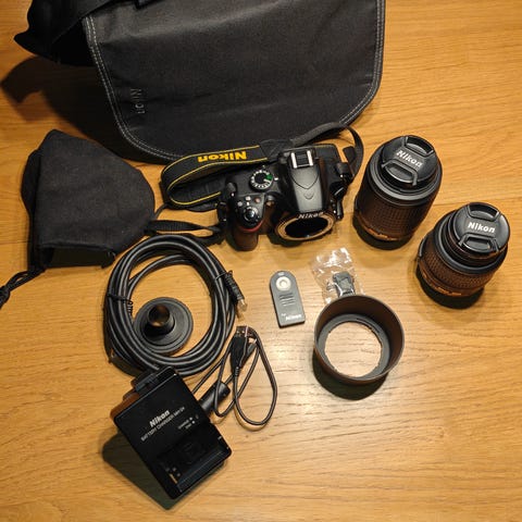 Nikon D3200 Digital systemkamera. Kamera med digital bildsensor, utrustad för att ta högupplösta bilder och filmer. Inkluderar objektiv och tillbehör för fotografering i olika miljöer.