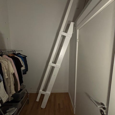 Mått: höjd hopfälld 225cm. Höjd till översta steget 147cm. Översta steget 26x26cm. Bredd nederst utfälld 121cm.