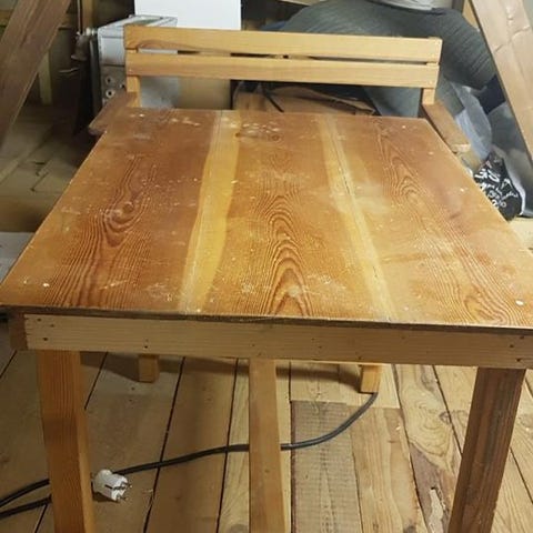Barnbord med fyra tillhörande stolar från MIO. Bordet och stolarna är i använt skick med lite skav och färg men möblerna har mkt kvar att ge.