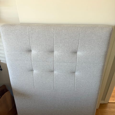 Jag säljer min bespoke sänggavel som passar 160 cm stor säng. Tillverkad av tapetserare för ett par år sedan och är i mycket bra skick. Snygg ljusgrön/ljust turkos färg. Tyg i hög kvalitet. Gaveln ställs bakom sängen på golvet, full höjd ca 105.5 cm, från golv till toppen på gavel, sängen bör vara ca 52 cm hög. Bredd ca 170 cm.