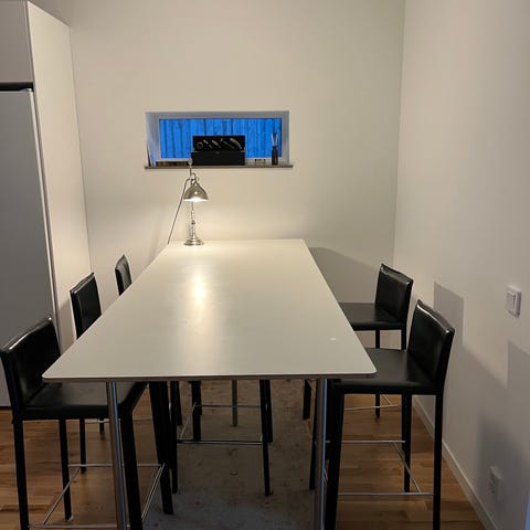 Stort matbord i tidlös design. I nyskick, tack vare sparsam användning och medföljande skyddskiva i laminerat glas. Även tilläggsskiva 50x100 medföljer. För fler bilder och mer info: https://bonusmobler.se/produkter/bord/koster-200x100-cm-vit-matbord