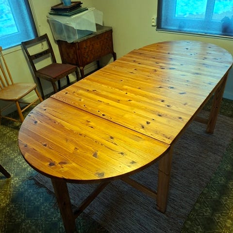 Ett stabilt och vackert slagbord från sent 1800-tal i massivt trä. Ett funktionellt bord med charm. Två lämnar fälls enkelt ut till ett stort bord.