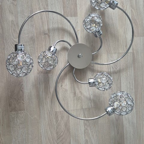 En taklampa i modern design med exklusiv, iögonfallande kromfärgad glasskärm och fina kromdetaljer.
