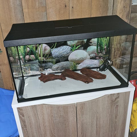 Juwel ca 250L ommålat vitt där jag lagt ut massor med pengar på. Tex svart sand för 1500:- (ca 30-40kg), dekorationer för en hel del pengar, wavemaker, fx5 filter. Svart bakgrundsbild, måtten på akvariumet är ca 40x50x120cm