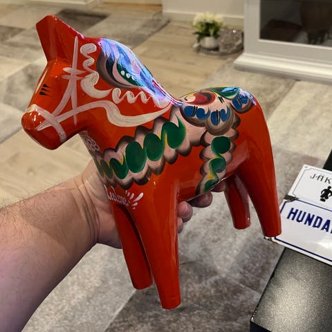 Grannas A Olsson Dalahäst i trä, röd med traditionell målad dekor. Handgjord i Mora, Sverige, med färgstarka mönster i blått, grönt, gult och svart. Ett dekorativt föremål som representerar svensk folktradition.