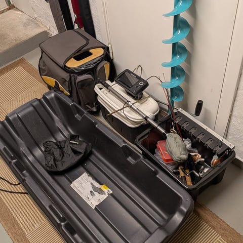 Hel fiskeutrustning. Ca 13 haspelrullar som ABU, Shimano, Mitcell, med spön. 3 havsfiskespön med spinnrullar, Pimpelspön ca 3st, 2 Pimpelstolar, 2 isborrar, Rantanen och Mora, Huggkrok, Sjöstövlar 43-44. Spinnare och drag för insjöfiske. Pirkar för både insjö och hav. Krokar. Linor. Isdubbar och broddar. Flytoverall. Flytvästar. Ryggsäck Haglöfs Skarja. Om ni vill byrån för förvaring. Dessutom om ni vill en uppblåsbar båt 3,90 meter som måste limmas på ett ställe. Allt måste hämtas så det behövs en släpkärra eller skåpbil. Allt eller inget.