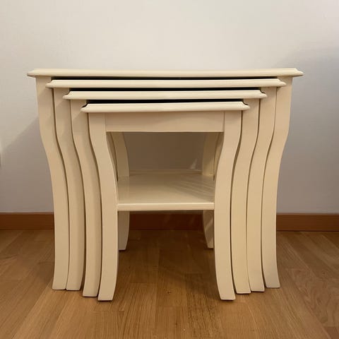 Hej! Jag säljer ett oanvänt set med 3 vita sidobord. Bordet är helt nytt och fortfarande i originalförpackning. Perfekt som soffbord, blom/bord eller nattduksbord då de har tre olika storlekar. Materialet är spånskiva och enkla att montera. Färg: vit.