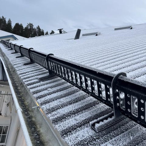 Komplett takrasskydd /snörasskydd för ca 11 meters tak, rasskyddet är 10,5 meter och består av 3st 3 meter plus 1st 1,5 meter samt 11 st hållare samt tillhörande skruv för montering av gallret på hållarna. Gallret är 13,5cm hög och hållarna är 45cm lång.