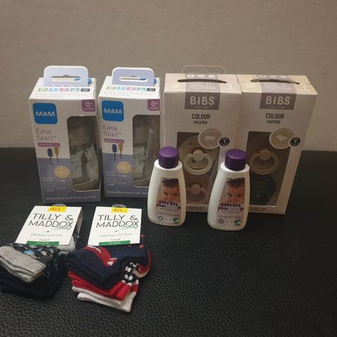 MAM nappflaskor i 2-pack med tillhörande extra nappar. Flaskorna är av plast och har olika färger och mönster. Passar för spädbarn och småbarn.