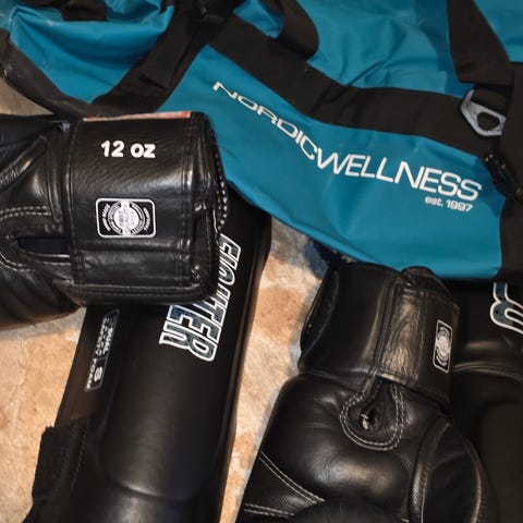 Boxnings- och kampsportsutrustning, boxningshandskar, benskydd, säckhandskar, fokusmitsar.