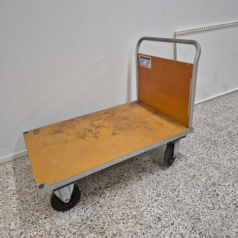 Plattformsvagn med gummiklädd lastplatta som passar för transport av diverse gods. Vagnen är hopfällbar för att spara plats vid förvaring.