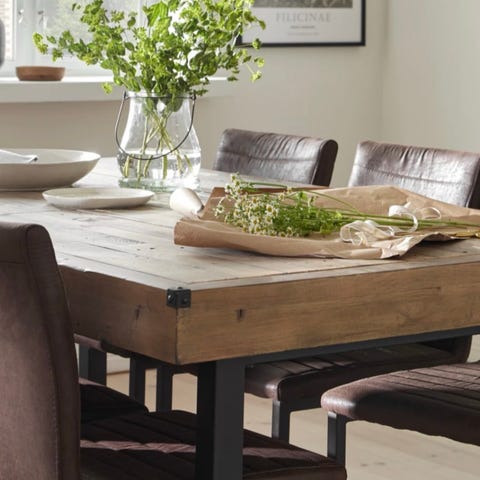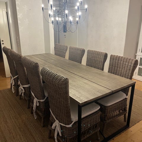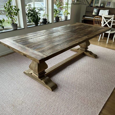 Matbord med grå träyta och två pelarformade ben. Bordet har en robust design och är lämpligt för matsal eller kök.