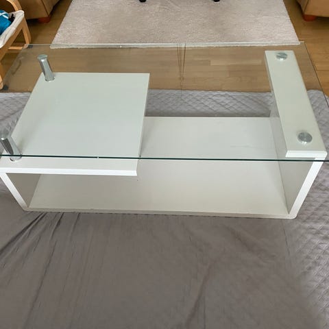 Oval soffbord med svart glas och metallram. Passar för vardagsrum eller loungeområden. Designad för att ge en modern och funktionell yta för förvaring och placering av föremål.