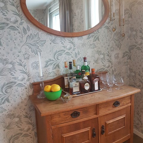 Ramen är i trä och har målats av mig. Under färgen finns ljust trä (se bild). Det finns några synliga spår av målningen om man tittar nära, men inget som syns på avstånd – spegeln ser väldigt fin ut när den hänger på väggen.