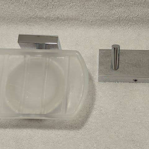 Porcelaine de Paris badrumstillbehör i porslin med dekor av rosor och gröna blad. Setet innehåller två muggar, två handtag, några krokar och diverse monteringsdelar i metall och porslin.