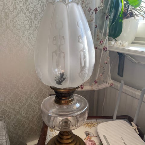 Bild 3: Gammal oljelampa i brunt glas, komplett med kupa i genomskinligt glas och brännare i mässing samt veke. 25 cm hög utan glaskupa, 48 cm hög med glaskupa. 300Kr
