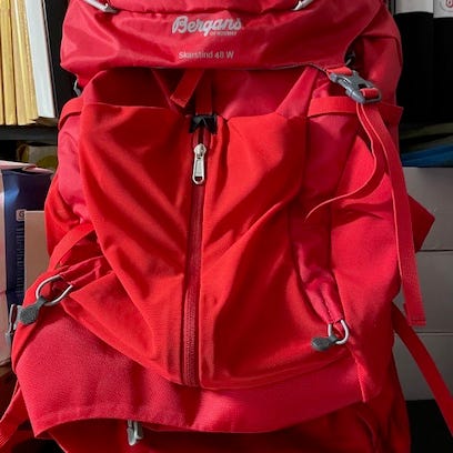 Shuosho 6000, 7 st säljes, ryggsäck i mörkblått och rosa med justerbara remmar. Ryggsäcken har flera fack och spännen för säker förvaring. Material och storlek är inte specificerade.