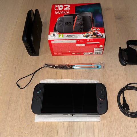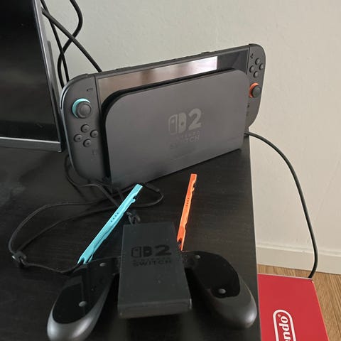Nintendo Switch 2 -modell spelkonsol med en 7-tums OLED-skärm. Konsolen har avtagbara Joy-Con-kontroller och stödjer både bärbart och stationärt spelande.