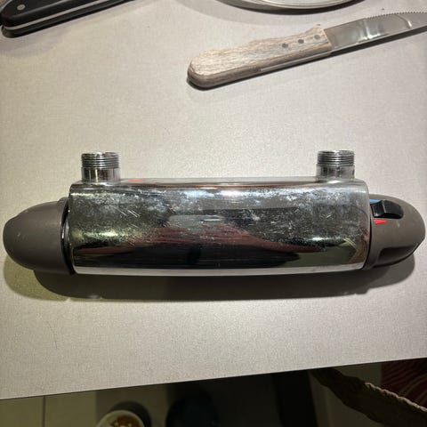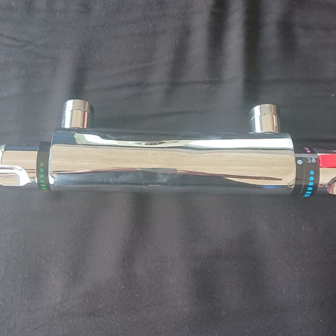 Termostatblandare med svart finish. Utrustad med två vred för temperatur- och flödeskontroll. Levereras i originalförpackning med tillhörande delar och manual. Passar för installation i badrum . Det är en bathlife brusa svart nytt i packet med alla sina tillbehör.