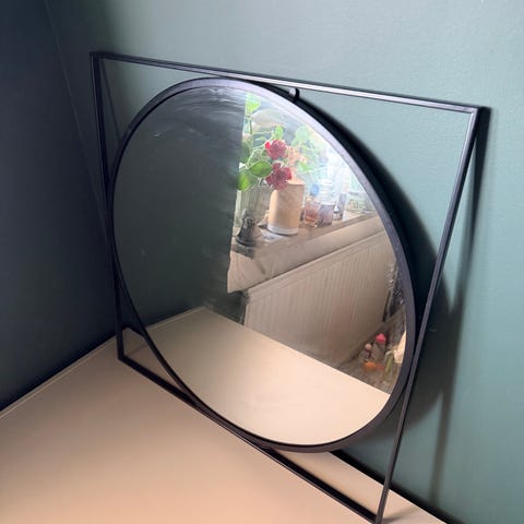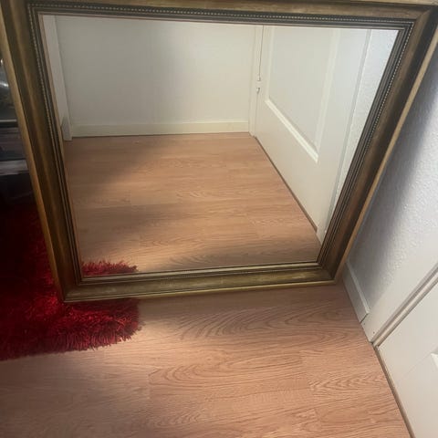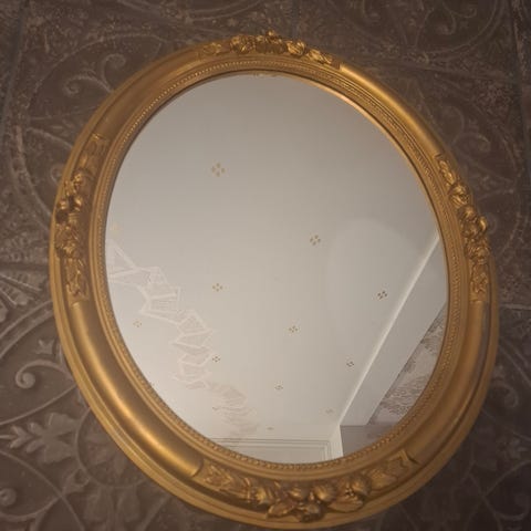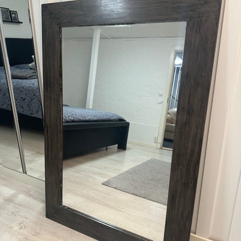 Stilren oval spegel med ram i träfinish. Passar bra i hall, sovrum eller vardagsrum och ger ett varmt, naturligt uttryck. Spegeln är lätt att hänga upp och i gott skick.