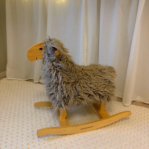 Teddykompaniet gunglamm med trädetaljer. Den har en mjuk pälsliknande yta och ett träunderrede för gungning. I mycket bra skick. Hämtas i Sjömarken, skickas ej. Perfekt som julklapp!